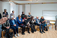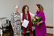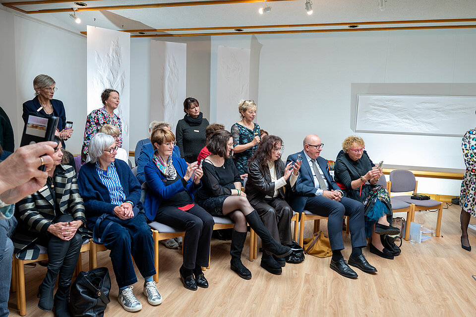 Es war ein Fest für die Sinne, ganz abgestimmt auf die Arbeiten der diesjährigen Preisträgerin Aja von Loeper aus Nürnberg. Mit ihren poetisch reliefierten klein- und großformatigen Arbeiten regt sie zum Schauen, Erkunden, Staunen, Befühlen und Nachdenken an. Man sitzt davor und kommt zur Ruhe oder man umkreist die Werke und besieht Vorder- und Rückseite, das Spiel mit Erhabenheit und Vertiefung, mit Licht und Schatten. Es ist zum Staunen und es reift die Erkenntnis: weiß ist nicht weiß. Aja von Loeper interagiert „nur“ mit weißem Papier und es ist unglaublich, welche Strukturen und Oberflächenveränderungen sie mit einem kleinen Holzkolben, Kraft, Mut, Geschick, Ausdauer und Erfahrung dem Papier abringt.
